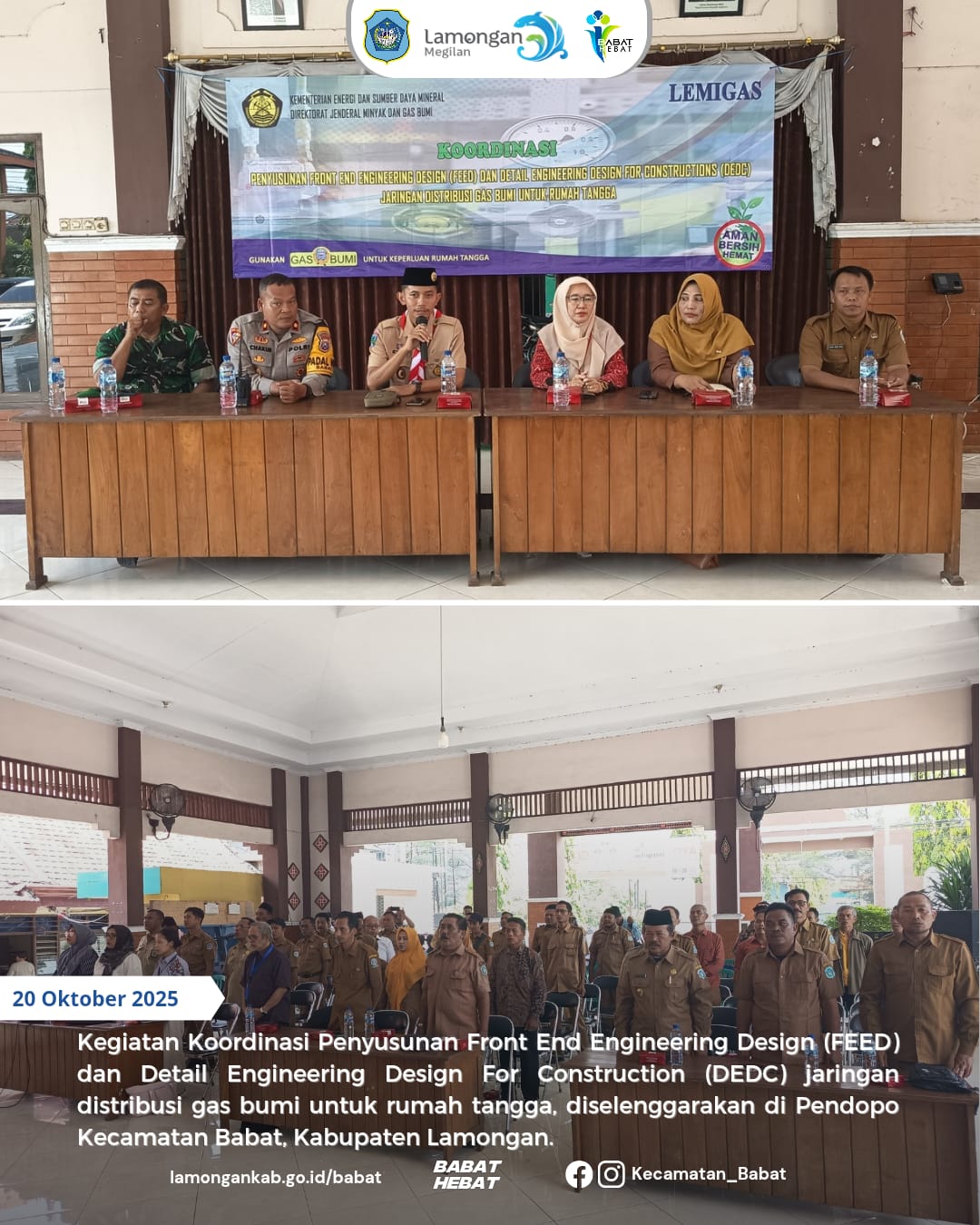 Kecamatan Babat menjadi tuan rumah kegiatan Koordinasi Penyusunan Front End Engineering Design (FEED) dan Detail Engineering Design for Construction (DEDC) jaringan distribusi gas bumi untuk rumah tangga. Melalui koordinasi ini diharapkan perencanaan jaringan gas bumi untuk kebutuhan rumah tangga dapat tersusun dengan baik, sehingga masyarakat dapat menikmati energi bersih, efisien, dan ramah lingkungan.