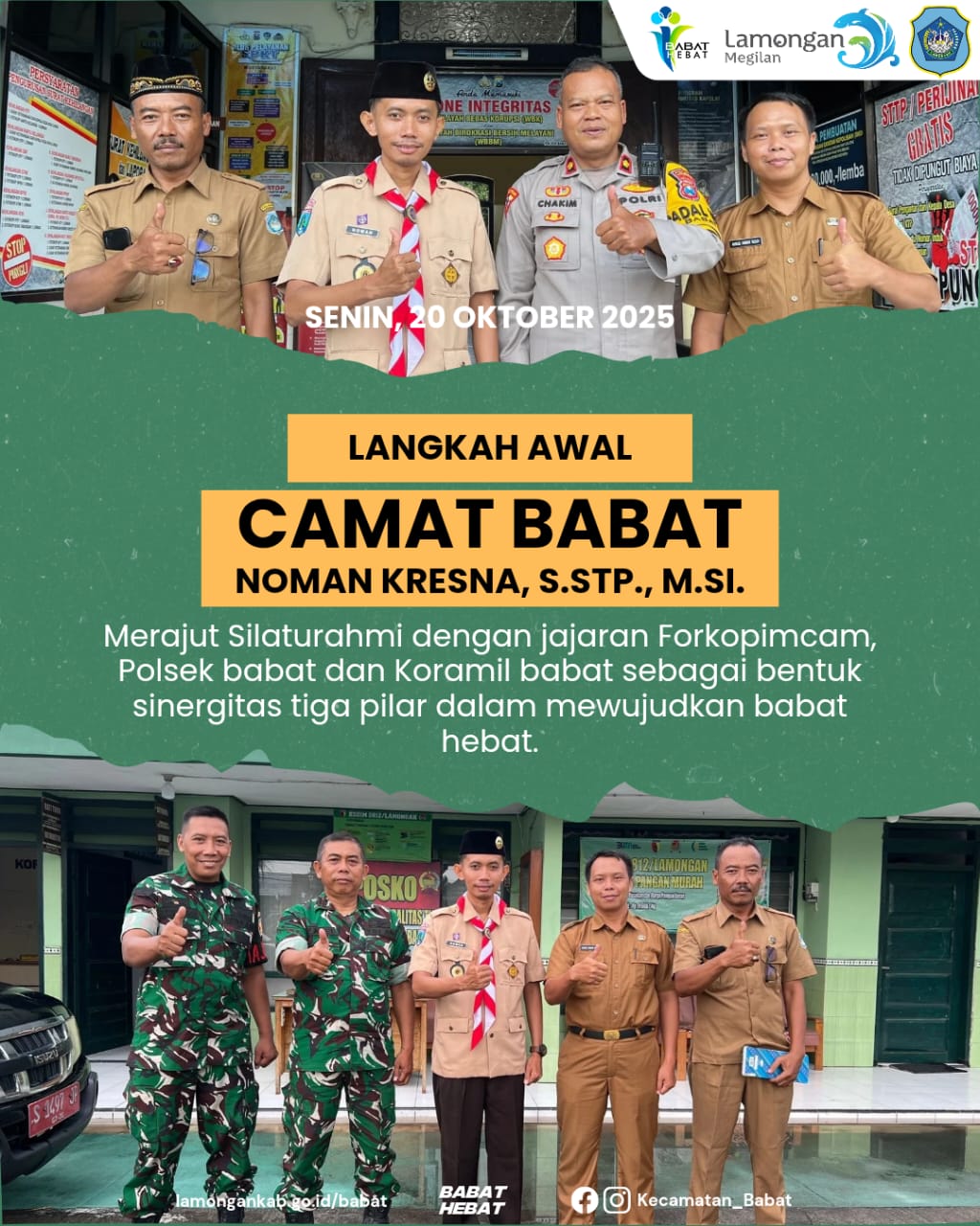 Camat Babat yang baru, Noman Kresna, S.STP., M.Si., memulai langkah awal kepemimpinannya dengan melakukan silaturahmi bersama jajaran Forkopimcam Babat, meliputi Kapolsek Babat dan Danramil Babat. Pertemuan ini menjadi simbol sinergitas tiga pilar pemerintahan di tingkat Kecamatan, antara Kecamatan, Polsek, dan Koramil—dalam mewujudkan visi bersama untuk membangun “Babat Hebat”. Melalui silaturahmi ini, Camat Babat menegaskan pentingnya kebersamaan, komunikasi, dan kolaborasi lintas sektor untuk memperkuat pelayanan publik serta menjaga stabilitas dan keamanan wilayah. Langkah awal penuh semangat ini diharapkan menjadi fondasi kokoh bagi sinergi berkelanjutan menuju Babat yang semakin maju, harmonis, dan berdaya saing.