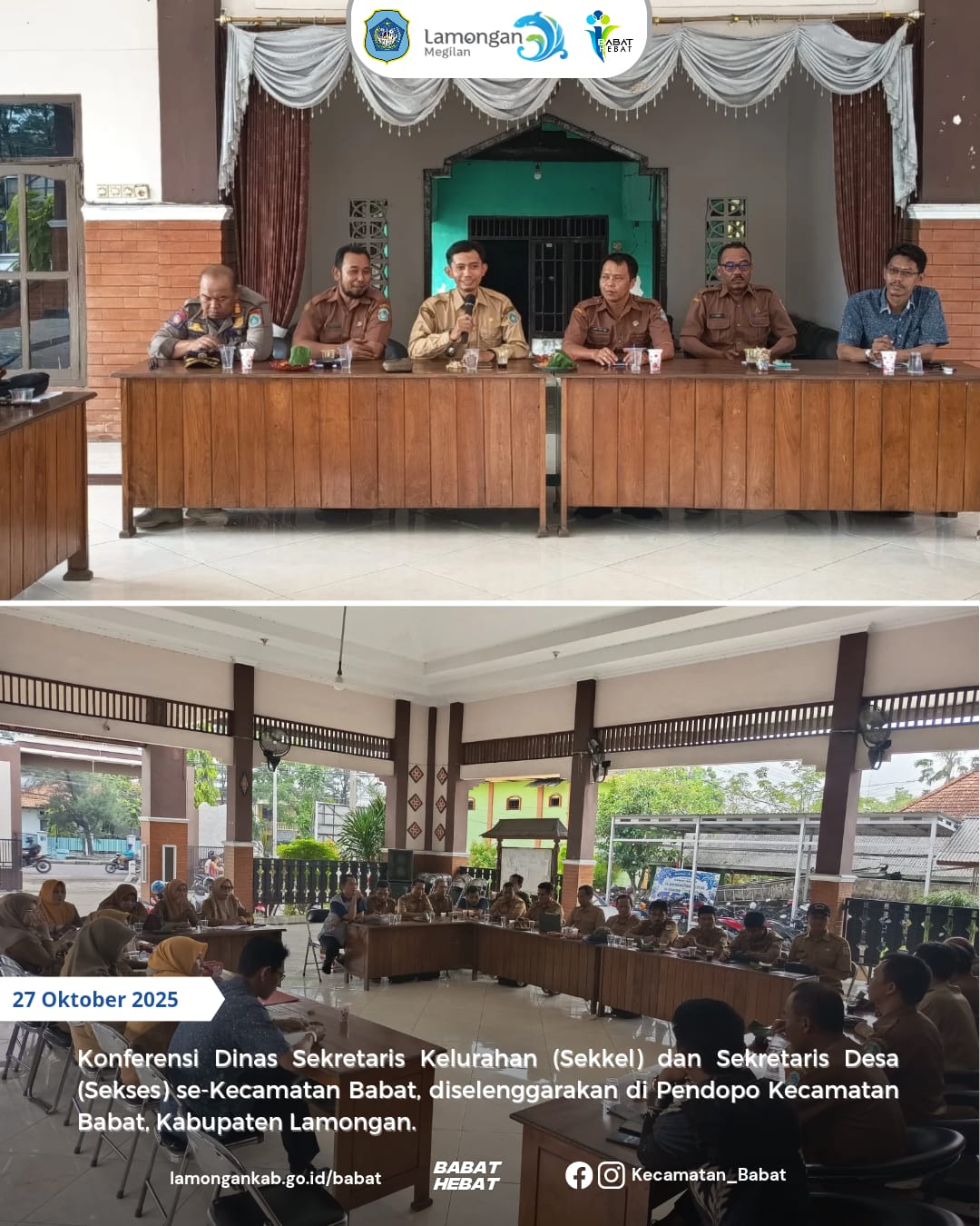 Babat (27/10/2025) — Konferensi Dinas Sekretaris Kelurahan (Sekkel) dan Sekretaris Desa (Sekdes) se-Kecamatan Babat diselenggarakan di Pendopo Kecamatan Babat, Kabupaten Lamongan. Kegiatan ini dihadiri oleh seluruh Sekkel dan Sekdes dari wilayah Kecamatan Babat.